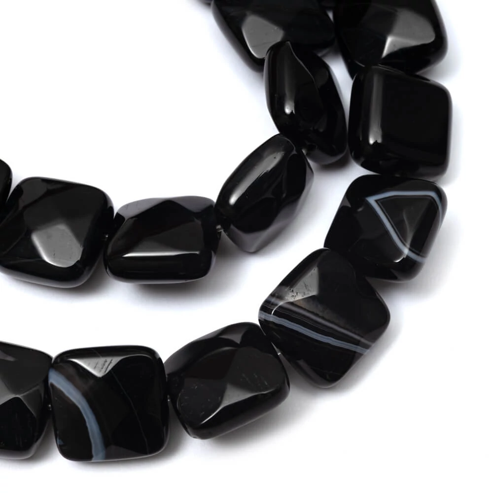 Csíkos achát, fekete kocka szál, fazettált, 12x12 mm, kb. 20 cm