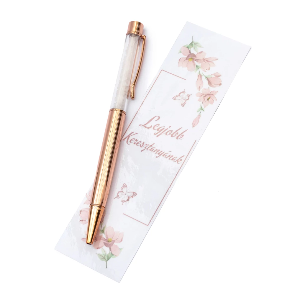 Golyóstoll, rózsakvarc, rosegold szín, Legjobb keresztanyának kísérőkártyával, virágos