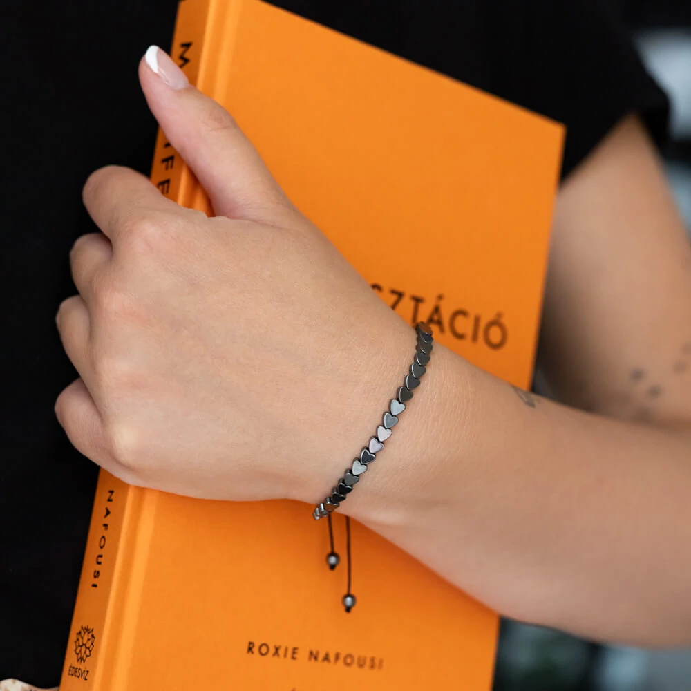 Hematit szíves madzagos karkötő, állítható 14-24 cm között