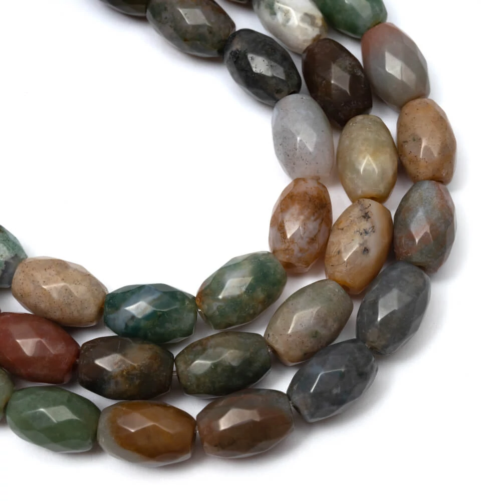 Természetes India achát, gazdag, földszínekben játszó árnyalatokkal – a zöld, barna, vörös és szürke tónusok harmonikus keveréke.