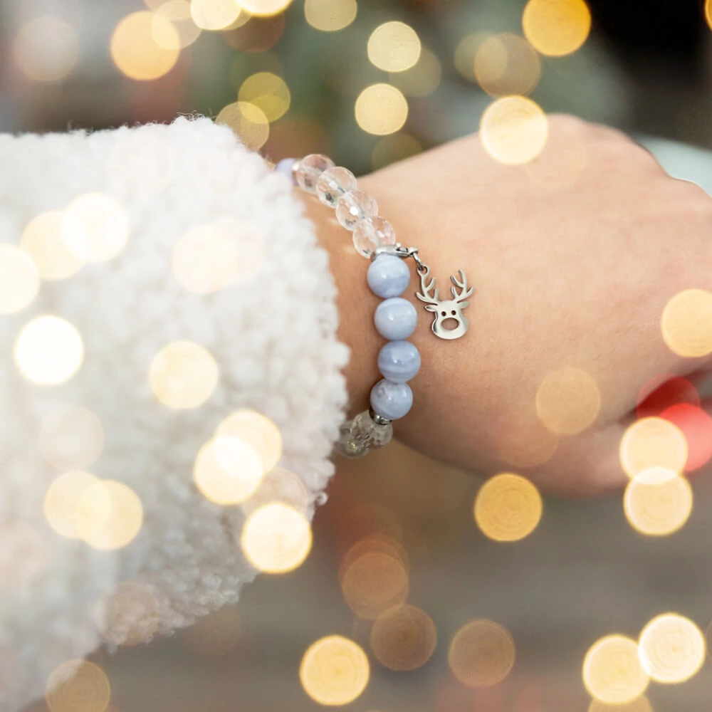Hangolódj az ünnepekre ezzel a kézzel készült karácsonyi gumis karkötővel! Az ásványgyöngyök és apró karácsonyi medálok az ünnep varázsát viszik a mindennapokba.