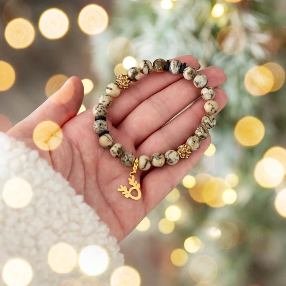 A puha, rugalmas gumiszálra fűzött gyöngyök és apró karácsonyi medálok az ünnep varázsát viszik a mindennapokba.