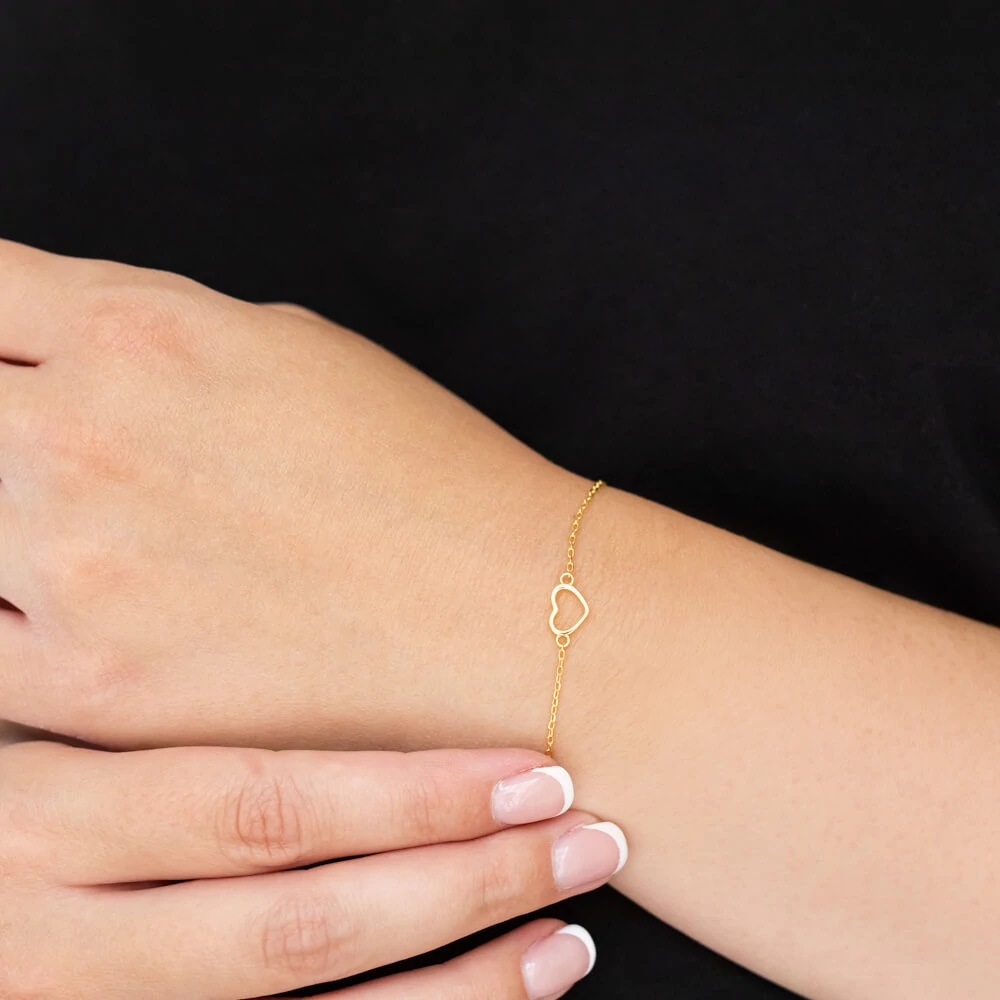 Arany szíves karkötő, arany színű lánchosszabbítóval.