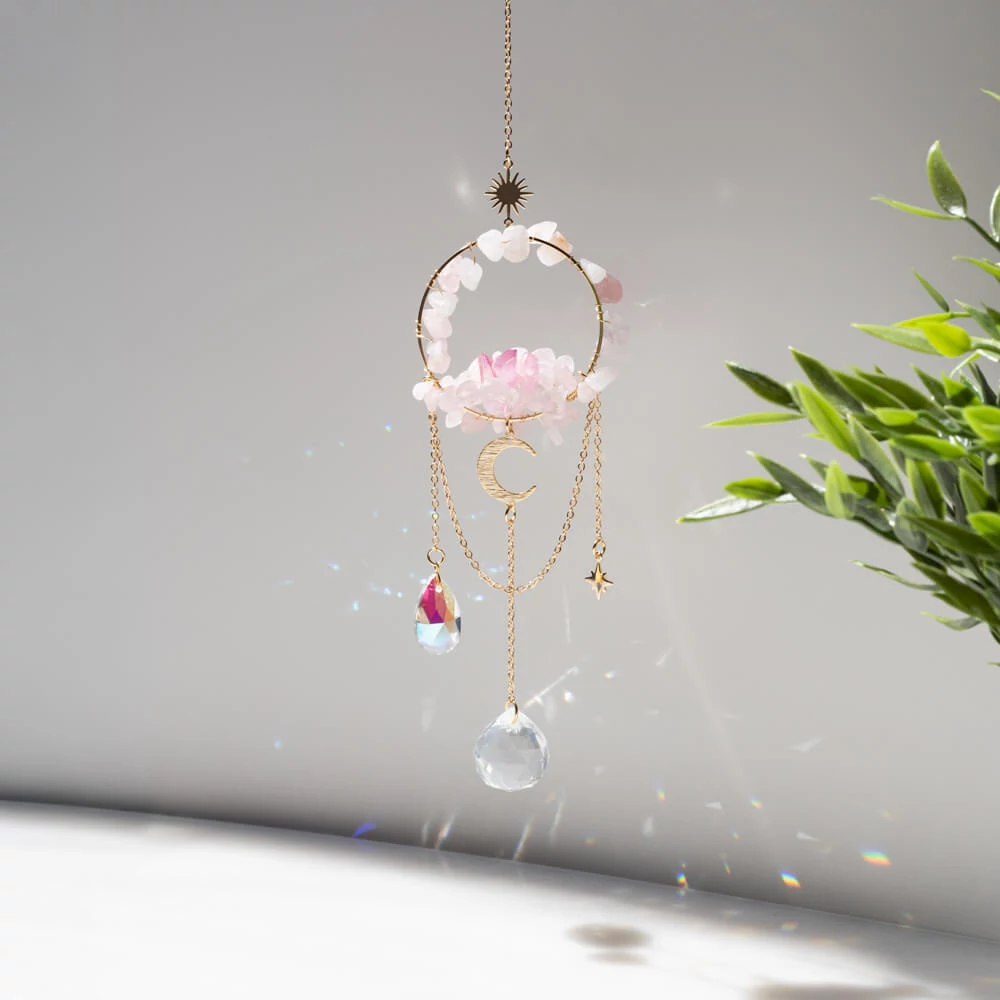 Egyedi lakásdekor napfogó hold motívummal, rózsakvarccal és festett hegyikristállyal. Fényben ragyogó dísz, mely harmóniát és nyugalmat áraszt otthonodban.