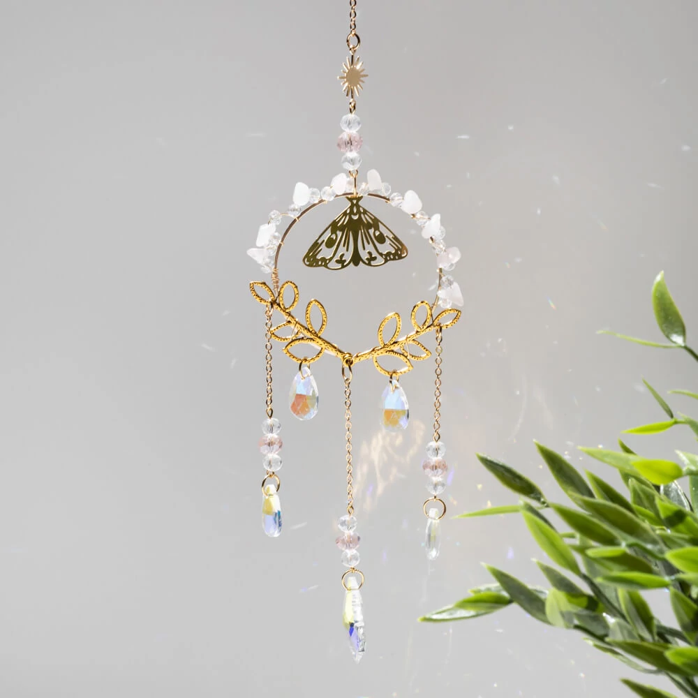Pillangós napfogó rózsakvarccal díszítve. Egyedi lakásdekor, mely színes fényeket szór, hangulatossá téve otthonod.