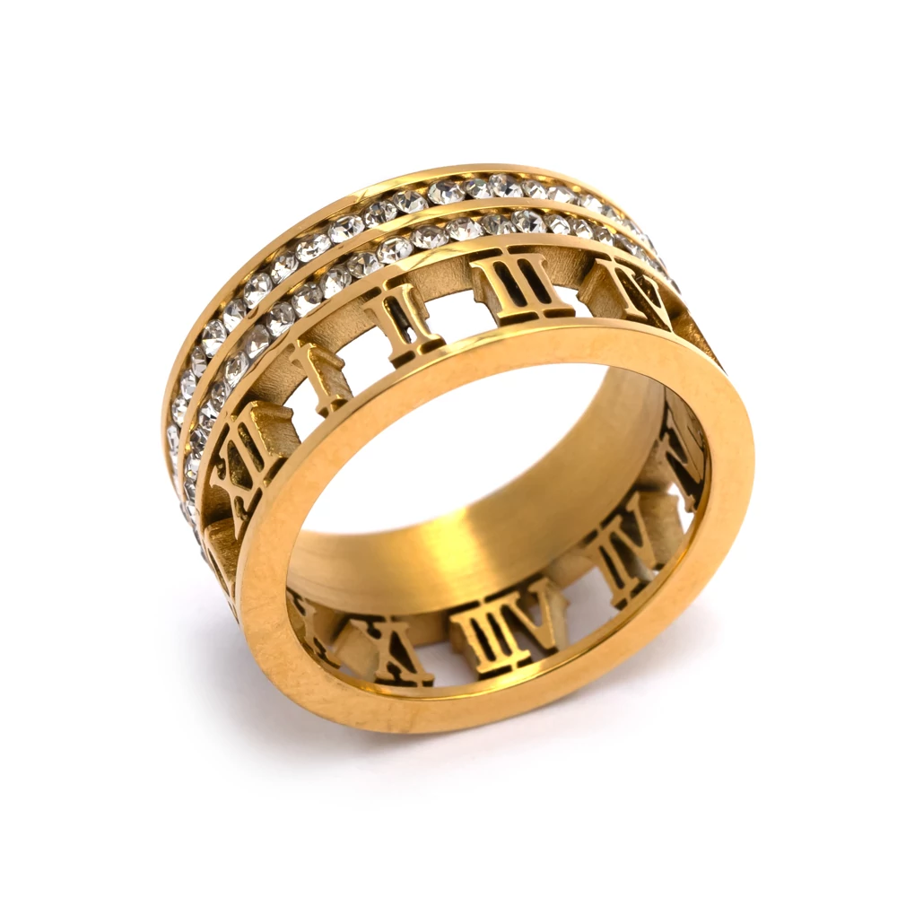 Nemesacél gyűrű, római számos-köves, arany színű, kb. 58-59 méret