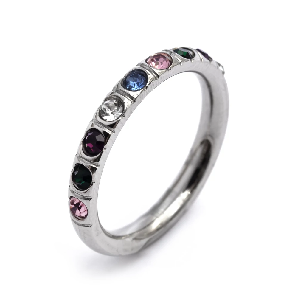Nemesacél gyűrű, vékony, színes köves, ezüst színű, kb. 58-59 méret