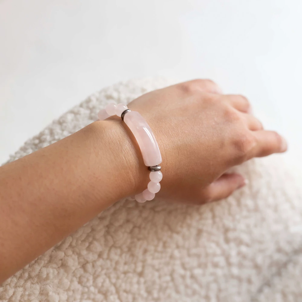 Rózsakvarc téglalap és 8 mm golyós, gumis karkötő, kb. 18-19 cm