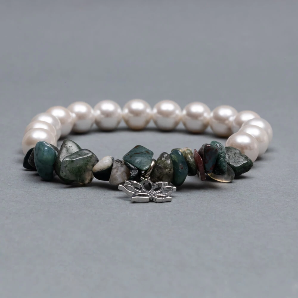 Shellpearl és indiai achát karkötő lótusz medállal 8mm
