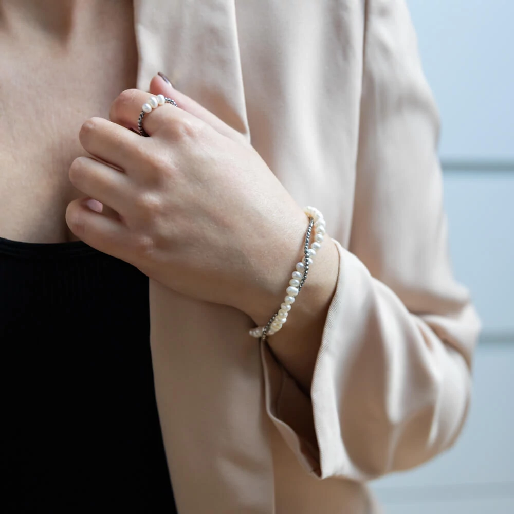 Tenyésztett gyöngy és fazettált hemtait gyöngy karkötő és gyűrű szett